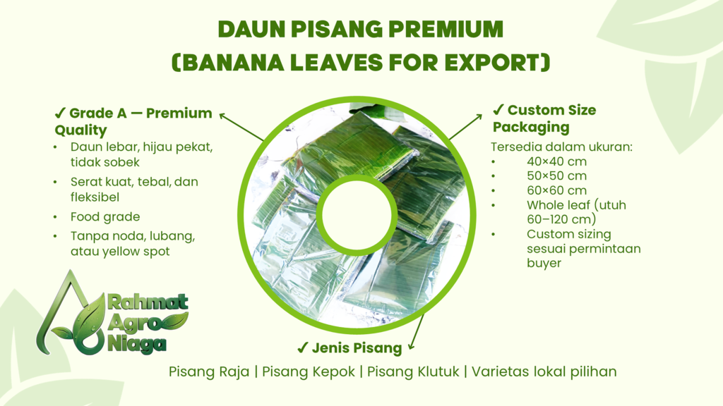 Daun pisang premium diproses melalui seleksi ketat, pembersihan higienis, dan pengemasan standar ekspor untuk memastikan kualitas tetap terjaga selama pengiriman jarak jauh.